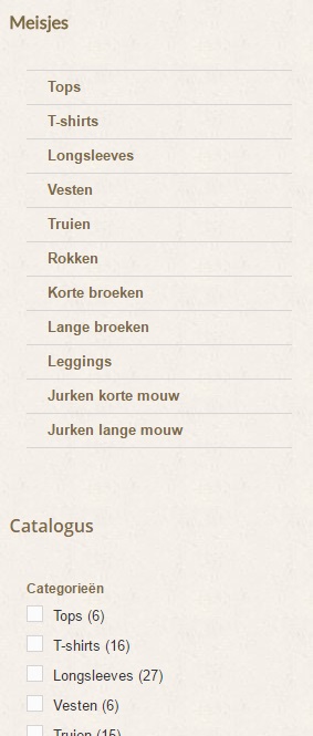 Mijnnaamisjudith Posted December 27, 2016 Share Posted December 27, 2016 Hallo, Vraag 1: Ik ben bezig met het vullen van de webshop in babykleding en kinderkleding. Wanneer ik klik op 'meisjes' krijgt ik in de linkerbalk netjes de catalogus te zien waarin ik kan filteren op categorie, maat, materiaal, etcetera. Klik ik vervolgens op 'jongens' dan zie ik die catalogus niet. Wat zie ik hier over het hoofd? Juist deze filter maakt het mogelijk om je zoekopdracht te verfijnen en prettiger te winkelen. Zie printscreen 1 en 2 Vraag 2: Ik heb categorieën aangemaakt die in het horizontale topmenu zichtbaar zijn en ook links in het verticale menu zichtbaar mogen zijn. Ze zijn echter ook zichtbaar boven de artikelen. Hoewel ik voor de vorm even plaatjes voor heb gemaakt vind ik het niet mooi en storend dat je naar beneden moet scrollen voordat de artikelen getoond worden. Kan ik dat ook uitzetten? M.a.w. kan ik ervoor zorgen dat er boven de artikelen niet eerst plaatjes te zien zijn? zie printscreen 3 Bij voorbaat dank! Judith Link to comment Share on other sites More sharing options...