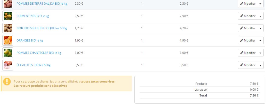 Après avoir essayé plusieurs manipulations, je me rends compte que c'est un seul produit qui n'est pas supprimable et qui fait tout beuguer. J'ai créé un nouveau produit que les clients ont commandé (échalotes les 500 g) et je me suis rendu compte que le produit en question avait une déclinaison par défaut 1kg ce qui donnait une fois le produit commandé une ligne dans la facture: échalote les 500g: 1 kg. Je suis donc allée supprimer les déclinaisons du produit et j'ai ensuite essayée de le supprimer de la facture. ca change le montant de la facture mais ca ne le supprime pas. J'ai donc essayé de mettre la facture en statut annulé pour pouvoir la refaire mais la non plus ca ne fonctionne pas (message d'erreur ci-joint).