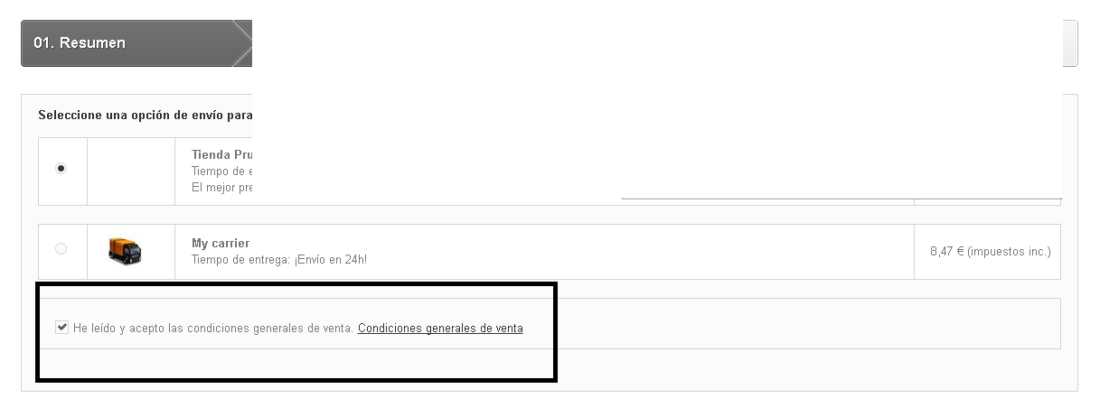 Pretendía que antes de terminar una compra, el cliente tuviese que aceptar las condiciones, pero únicamente aparece cuando un cliente se registra.