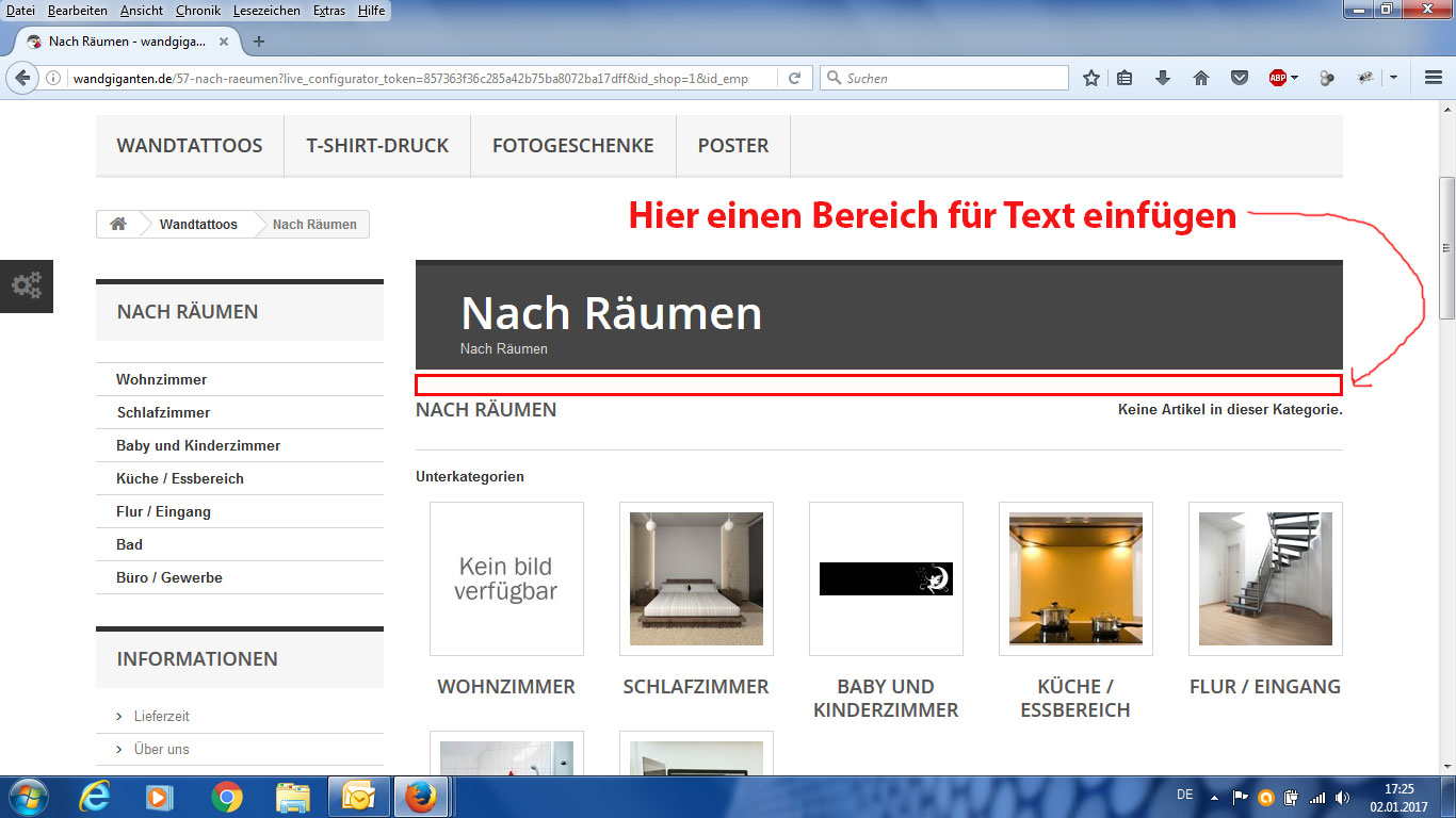 knecht2020 Posted January 2, 2017 Share Posted January 2, 2017 Hallo zusammen, ich wünsche ein gesundes neues Jahr. Nun zu meiner Frage, gibt es eine (einfache) Möglichkeit unter dem Kategoriebild einen Bereich für Text einzufügen? Evtl. über ein Modul oder über die Templatdatei (wenn es für einen Laien wie mich zu schaffen ist) oder könnte das jemand, gegen Bezahlung, für mich machen. Ein Bild wo der Block sein soll hänge ich an. Danke Gruß Werner Link to comment Share on other sites More sharing options...