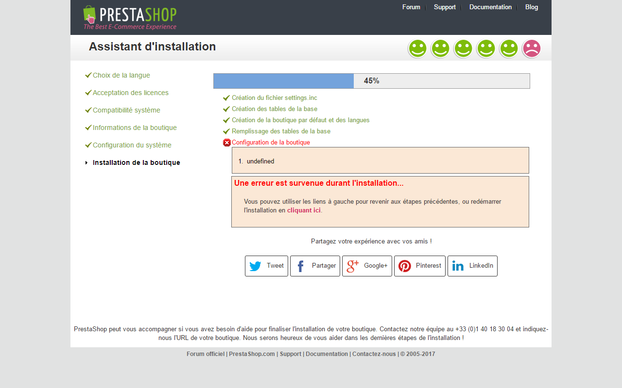 teurf1dumas Posted January 9, 2017 Share Posted January 9, 2017 Bonjours, j'ai voulu installer Prestashop avec la dernière version sur mon serveur mais malheureusement au moment du chargement du settings.inc. arrivé a la configuration de la boutique, sa marche erreur indéfini. quelqu'un aurai une solutions s'il vous plait ? Link to comment Share on other sites More sharing options...