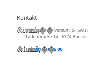 cowe Posted January 10, 2017 Share Posted January 10, 2017 Hallo zusammen Erst einmal ein fröhliches 2017 Ich habe da ein Problem: wer kann mir erklären, wie man diese Zeichen wie auf dem Bild wieder los wird? Sehen tut man es hier: https://www.matratzen-universum.ch/de/ Und zwar ganz unten am Seitenende bei Kontakt. Danke Grüsse Link to comment Share on other sites More sharing options...