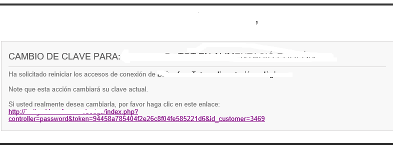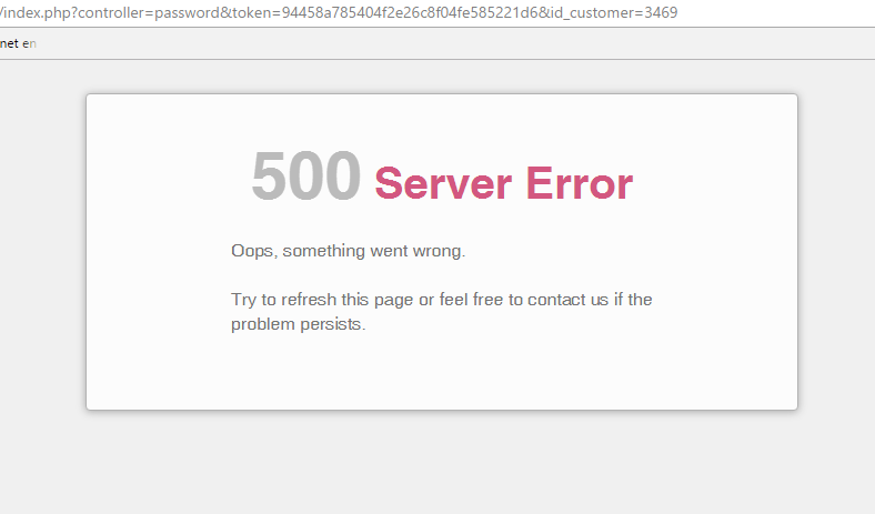 .bio. Posted January 13, 2017 Share Posted January 13, 2017 (edited) Hola a todos! Es mi primer proyecto en Prestashop y tengo casi todo listo menos esto. He estado testando todas las funciones para comprobar su correcto funcionamiento y la única opción que me da error es la de recuperar la contraseña del cliente. Configuré todas las opciones de correo y los envía correctamente. Pero luego al pulsar el enlace que me llega al correo, me salta la pantalla de error 500. Adjunto unas capturas. Edited January 13, 2017 by .bio. (see edit history) Link to comment Share on other sites More sharing options...