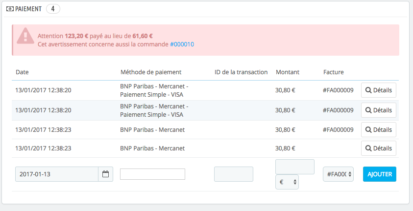 Jneow Posted January 13, 2017 Share Posted January 13, 2017 Bonjour à tous ! Fait étrange, j'ai reçu une commande en double, je m'explique : - Même client, 1 seul produit à 30,80€ - Les commandes ont la même réference - Les commandes ont la même date et heure 13/01/2017 12:38:05 En revanche j'ai bien une seul transaction sur mercanet. Lorsque je vais sur la fiche de mon client l'encart paiement cumule des transactions inexistantes. Je pense que le problème viens d'un double traitement qui serait causé par le module SuperCheckout qui était actif mais en mode test au moment de la commande. Voici ce qu'il se trouve dans les logs 1 Frontcontroller::init - Cart cannot be loaded or an order has already been placed using this cart Cart 75 0x 0 13/01/2017 12:44:33 Sachant qu'il m'est impossible légalement de supprimer une commande comment puis-je me débarrasser de ce doublon ? Merci par avance ! Link to comment Share on other sites More sharing options...
