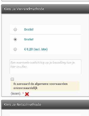 sonjasonja Posted January 16, 2017 Author Share Posted January 16, 2017 Ik ben er achter waar het probleem zit: Mijn theme heeft als standaard instelling (themes/mytheme/css/responsive.css) dat de beschrijving van de vervoerder wordt verborgen als je op een klein scherm kijkt. Maar mijn One Page Checkout module heeft als standaard instelling dat bij kleine schermen de naamgeving en het plaatje van de vervoerder wordt verborgen. Die twee gecombineerd, zorgt ervoor dat zowel plaatje, beschrijving en naamgeving niet zichtbaar zijn. De modulebouwer van de OPC gaat in de OPC module dit aanpassen, waardoor op kleine schermen de naamgeving en plaatje zichtbaar blijven. :-) Link to comment Share on other sites More sharing options...