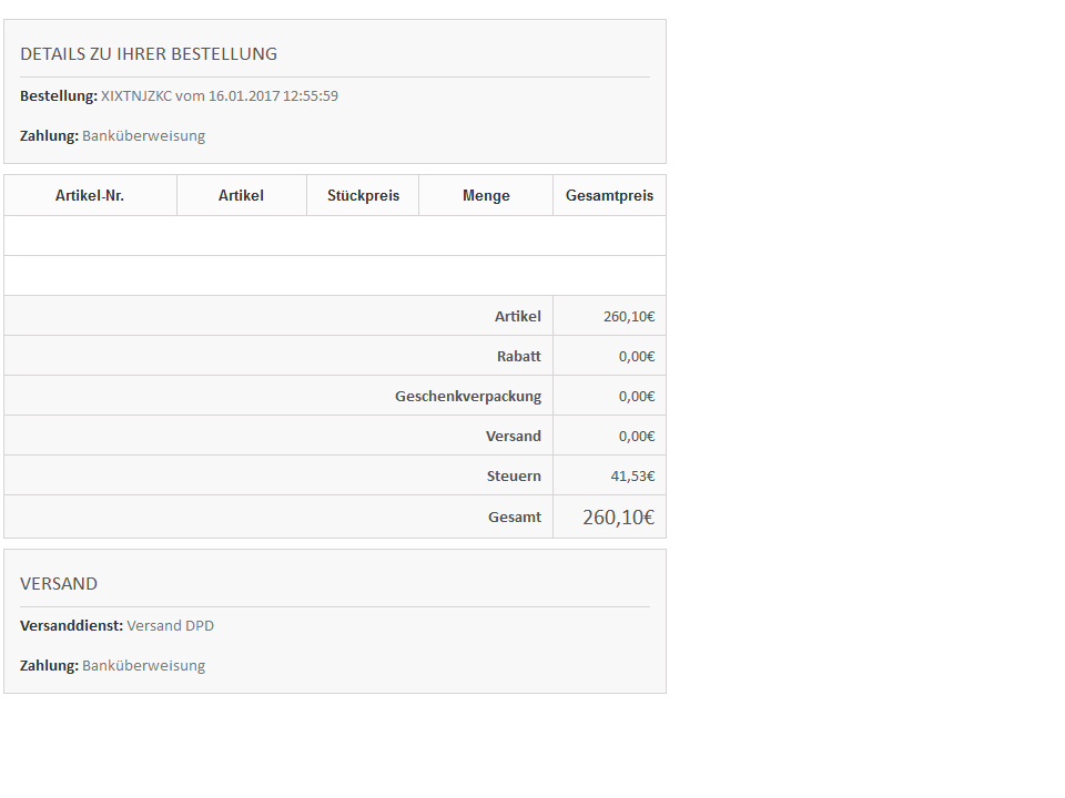 masterriemi1702 Posted January 16, 2017 Share Posted January 16, 2017 Hallo zusammen. Ich habe ein Shopsystem (1.6.1.9) wo der Kunde nach der Bestellung eine Mail mit seiner Rechnung bekommt (Bestellbestätigung). Diese Mail kommt auch an aber leider erscheint darauf keine Artikelnummer, Artikel, Stückpreis etc. sondern nur die Preise. Hab ich irgendwas falsch gemacht das das nicht mehr funktioniert ? oder besser: wie kann ich es editieren und erscheinen lassen ? LG Link to comment Share on other sites More sharing options...