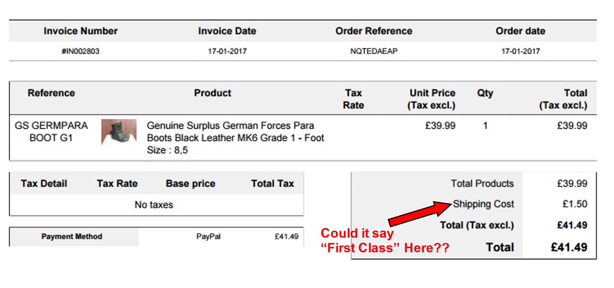 militaryamy Posted January 18, 2017 Share Posted January 18, 2017 Hello - I have Prestshop 1.6.1.4 I have set up the couriers for my shop and all is working fine. When I print and invoice is correctly displays and calculates the shipping costs based on whether the customer has chosen free second class delivery or paid extra for first class or next day delivery. However its just a number in the box and can easily be missed by staff - is there any way I can have it written in letters next to this figure which delivery speed/courier they have chosen so staff can quickly and easily check before despatch? If its code I'll have to pass it on to my IT man but if anyone has any ideas I would be very grateful Thank you x Link to comment Share on other sites More sharing options...
