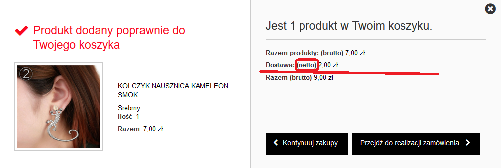 Mam następujący problem. Podczas dodawania szybkiego do koszyka cena kosztu dostawy pojawia się jako "netto". Mam w sklepie finalizację zakupuj na jednej stronie (bez przechodzenia przez kolejne etapy), i tam już wszystkie kwoty wysyłki są w brutto. W ustawieniach w przewoźnicy ustawiłem podatek dla wysyłki VAT 0%, i nie działa to, tak samo jak próbowałem z VAT 23% też nie pomaga. Jak wybieram opcję "bez podatku" to jest to samo. Jak to zrobić żeby informacja w nawiasie była (brutto) ?