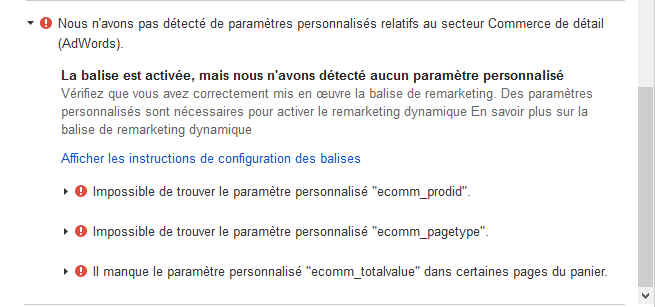 PR1989 Posted January 19, 2017 Share Posted January 19, 2017 (edited) Bonjour,j'ai un problème avec la détection des paramètres personnalisé "ecomm_prodid", "ecomm_pagetype", "ecomm_totalvalue", il m'affiche un message (Nous n'avons pas détecté de paramètres personnalisés relatifs au secteur Commerce de détail (AdWords).) malgré que j'ai met le script dans la footre avec les condition {if}{elseif}, et avec l'extension google tag tous pass bien et toujours en vert sur tous les pagevoilà le code: {if isset($page_name) && !empty($page_name)} {if $page_name|escape:'html':'UTF-8' == 'index'} {assign var="page_name" value="'home'"} {literal} <script type="text/javascript"> var google_tag_params = { ecomm_prodid: {/literal}0{literal}, ecomm_pagetype: {/literal}{$page_name}{literal}, ecomm_totalvalue: {/literal}0{literal} }; </script> {/literal} {elseif $page_name|escape:'html':'UTF-8' == 'category'} {literal} <script type="text/javascript"> {/literal} {$category=$product.category_default|replace:' ':'_'} {literal} var google_tag_params = { ecomm_prodid:[{/literal}{foreach from=$products item=product name=products} {literal}'hspfr{/literal}{$product.id_product|intval}{literal}'{/literal}, {/foreach} {literal} ] , ecomm_pagetype: 'category', ecomm_totalvalue: [{/literal}{foreach from=$products item=product name=products} {$product.price|string_format:"%.2f"}, {/foreach} {literal}] }; </script> {/literal} {elseif $page_name|escape:'html':'UTF-8' == 'order'} <script type="text/javascript"> {$price=$total_price|replace:'€':''} var google_tag_params = { ecomm_prodid: {foreach from=$products item=product name=productLoop}{$product.id_product}{/foreach}, ecomm_pagetype: 'cart', ecomm_totalvalue: {$price} }; </script> {elseif $page_name|escape:'html':'UTF-8' neq 'category' && $page_name|escape:'html':'UTF-8' neq 'product' && $page_name|escape:'html':'UTF-8' neq 'order' && $page_name|escape:'html':'UTF-8' neq 'order-confirmation'} {assign var="page_name" value="'other'"} {literal} <script type="text/javascript"> var google_tag_params = { ecomm_prodid: {/literal}0{literal}, ecomm_pagetype: {/literal}{$page_name}{literal}, ecomm_totalvalue: {/literal}0{literal} }; </script> {/literal} {/if} {/if} {literal} <!-- Code Google de la balise de remarketing N3RD--> <!-------------------------------------------------- Les balises de remarketing ne peuvent pas être associées aux informations personnelles ou placées sur des pages liées aux catégories à caractère sensible. Pour comprendre et savoir comment configurer la balise, rendez-vous sur la page http://google.com/ads/remarketingsetup. ---------------------------------------------------> <script type="text/javascript"> /* <![CDATA[ */ var google_conversion_id = XXXXXXXXX; var google_custom_params = window.google_tag_params; var google_remarketing_only = true; /* ]]> */ </script> <script type="text/javascript" src="//www.googleadservices.com/pagead/conversion.js"> </script> <noscript> <div style="display:inline;"> <img height="1" width="1" style="border-style:none;" alt="" src="//googleads.g.doubleclick.net/pagead/viewthroughconversion/XXXXXXXXX/?guid=ON&script=0"/> </div> </noscript> {/literal}je besoin de l'aide svp Edited January 27, 2017 by PR1989 (see edit history) Link to comment Share on other sites More sharing options...