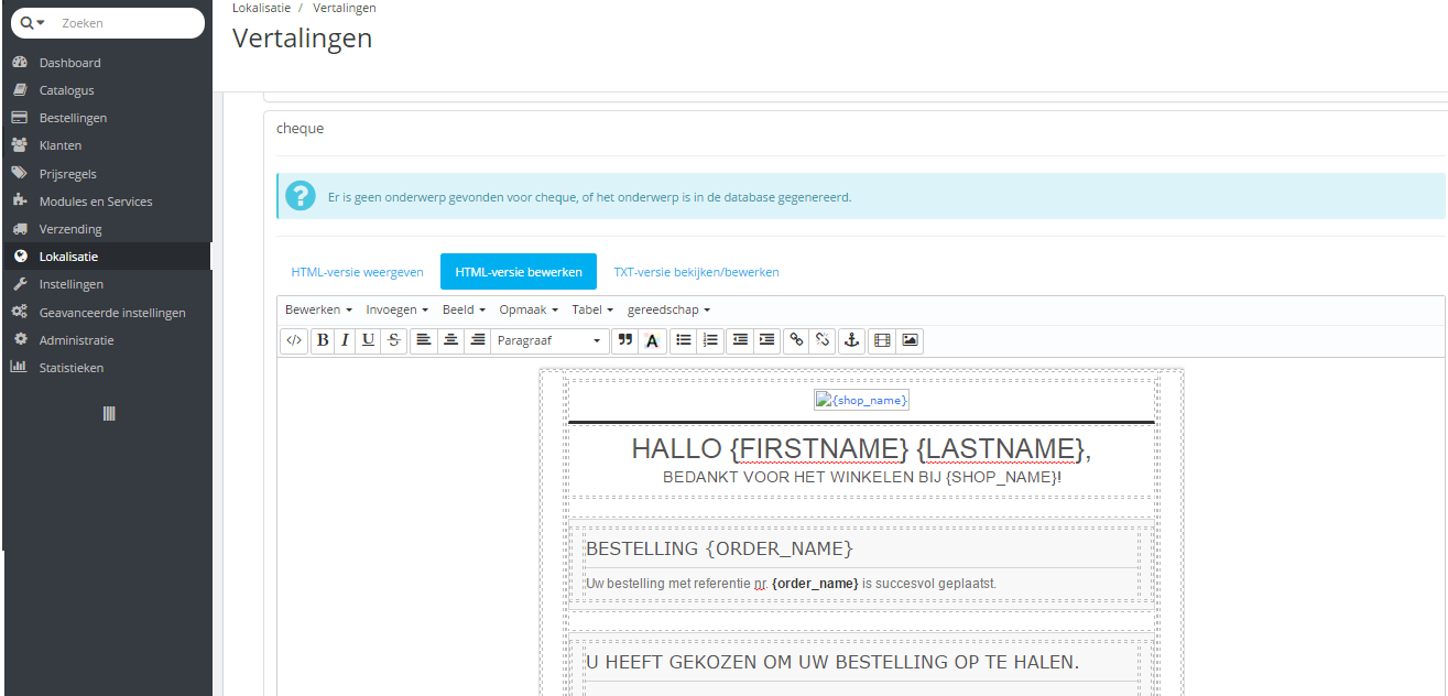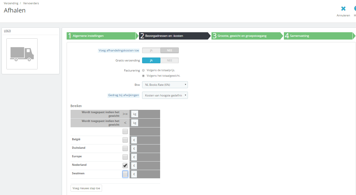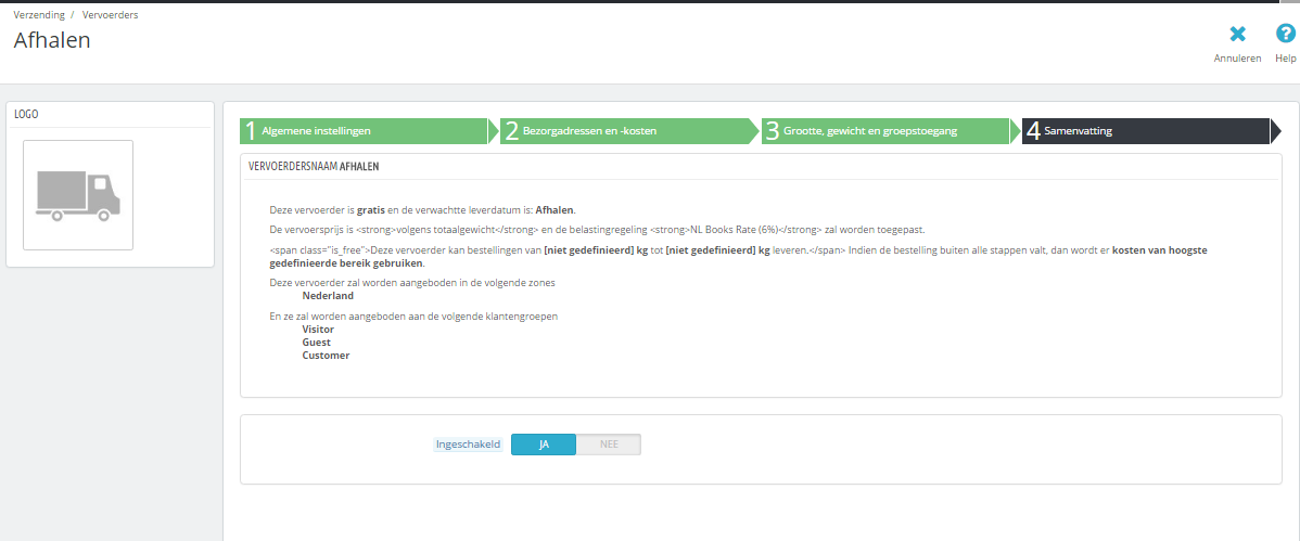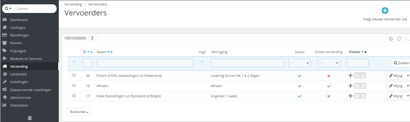 Mijnnaamisjudith Posted January 22, 2017 Share Posted January 22, 2017 Ik ben naar aanleiding van dit topic aan de slag gegaan: https://www.prestash...en-bij-ophalen/ -> Ik heb stap 1, de betaling per cheque, omgebouwd naar ophalen (printscreen 1) en bij stap 2 heb ik de vertalingen van de e-mail template aangepast (printscreen 2). -> Ik heb bij vervoerders een optie 'afhalen' aangemaakt (zie printscreen 3 t/m 6). Ik twijfel overigens ook of ik bij deze optie wel alles goed heb ingevuld. Hoe zorg ik nu dat de optie 'afhalen' ook zichtbaar wordt? Moet er nog ergens iets gekoppeld of geactiveerd worden? In feite mag iedereen die optie kiezen alleen zullen in de praktijk alleen mensen uit de buurt hiervoor kiezen. Er moet dan dus niet doorverwezen worden naar een betaalprogramma maar ze mogen in de winkel contant betalen of pinnen. Ik zie ergens iets over het hoofd maar krijg het niet bedacht. Hoop dat iemand de oplossing heeft!! Link to comment Share on other sites More sharing options...