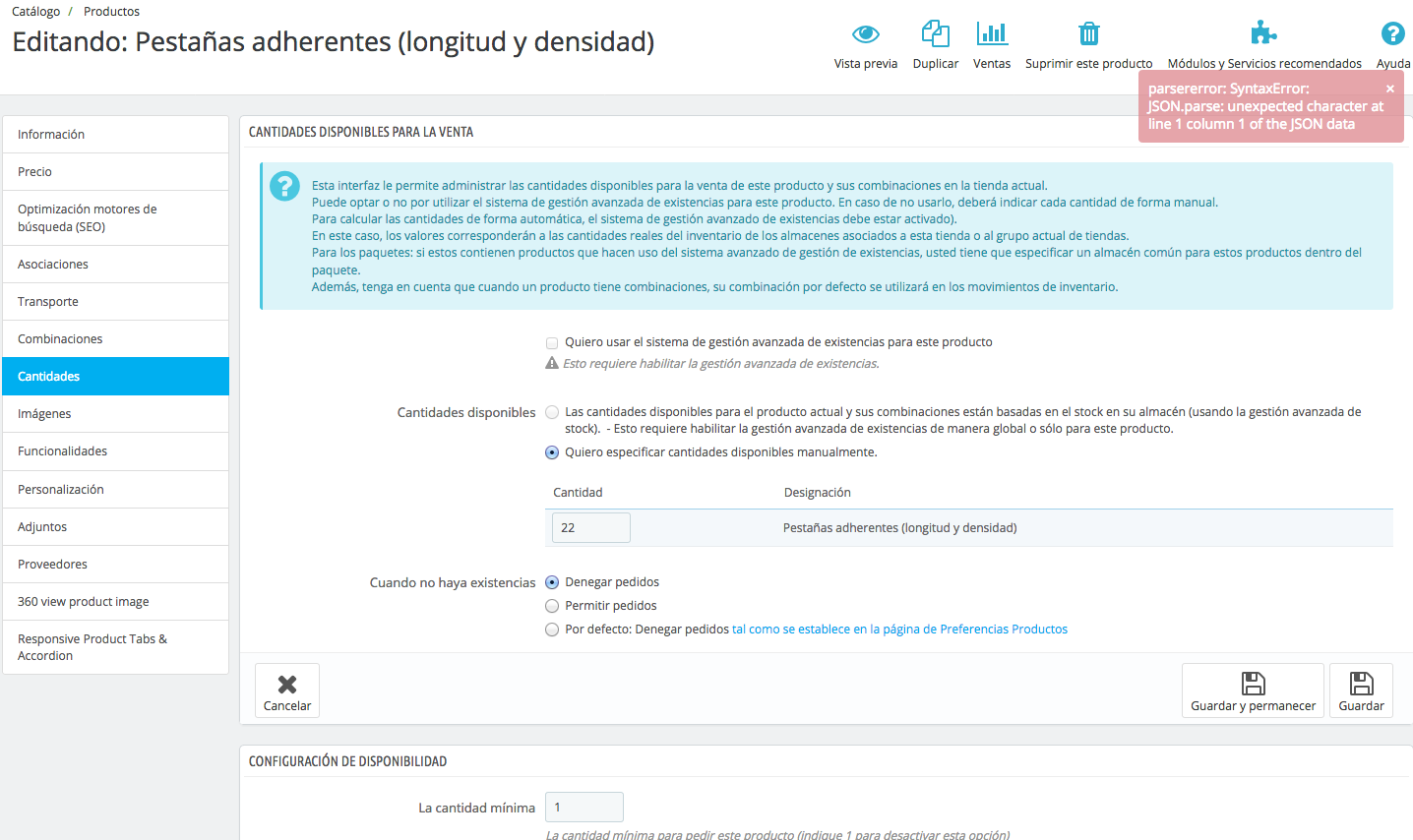 ECjuanan Posted January 23, 2017 Share Posted January 23, 2017 Cuando intento actualizar un producto, el valor de cantidad de stock no se me actualiza correctamente. Tengo activado la gestion - Quiero especificar cantidades disponibles manualmente. Cuando voy a la casilla de cambiar la cantidad me sale un error. parsererror: SyntaxError: JSON.parse: unexpected character at line 1 column 1 of the JSON data Y aunque le de a guardar el valor no se me actualiza en base de datos, He mirado en mil sitios y no he encontrado solución alguna, si alguién me puede ayudar se lo agradecería. Un saludo y gracias de antemano. Link to comment Share on other sites More sharing options...