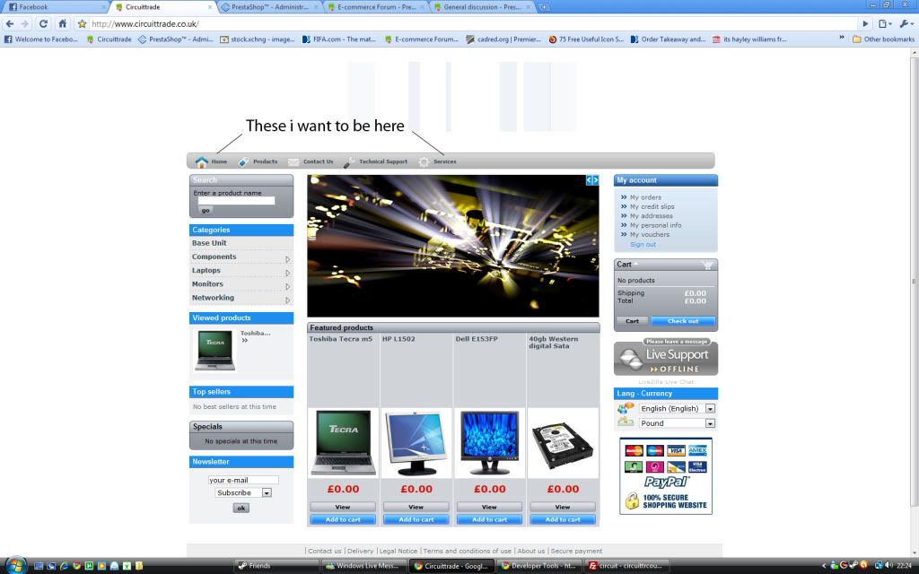 Ruscle Posted June 15, 2010 Share Posted June 15, 2010 Hi ,I am currently still designing my store and i need some help with a few things , if you wouldn't mind given me some help to solve this issues i would be very grateful 1.Module JBX Menu I would like to know how i can center these buttons to the middle of the menu bar not to the lefthttp://i46.photobucket.com/albums/f131/rusta16/Menucenter.jpg2.Module JBX Menu I want to make the menu slightly wider so it lines up with the end of my account box , as you can see its slightly offhttp://i46.photobucket.com/albums/f131/rusta16/Menuwidth.jpg3. Subcategory's Can i make them bigger images and look better ? http://www.circuittrade.co.uk/category.php?id_category=14.Internet explorer problemSome of the modules used on my store do not work properly in IE , any reason?If anyone can solve these for me i would be so grateful Link to comment Share on other sites More sharing options...