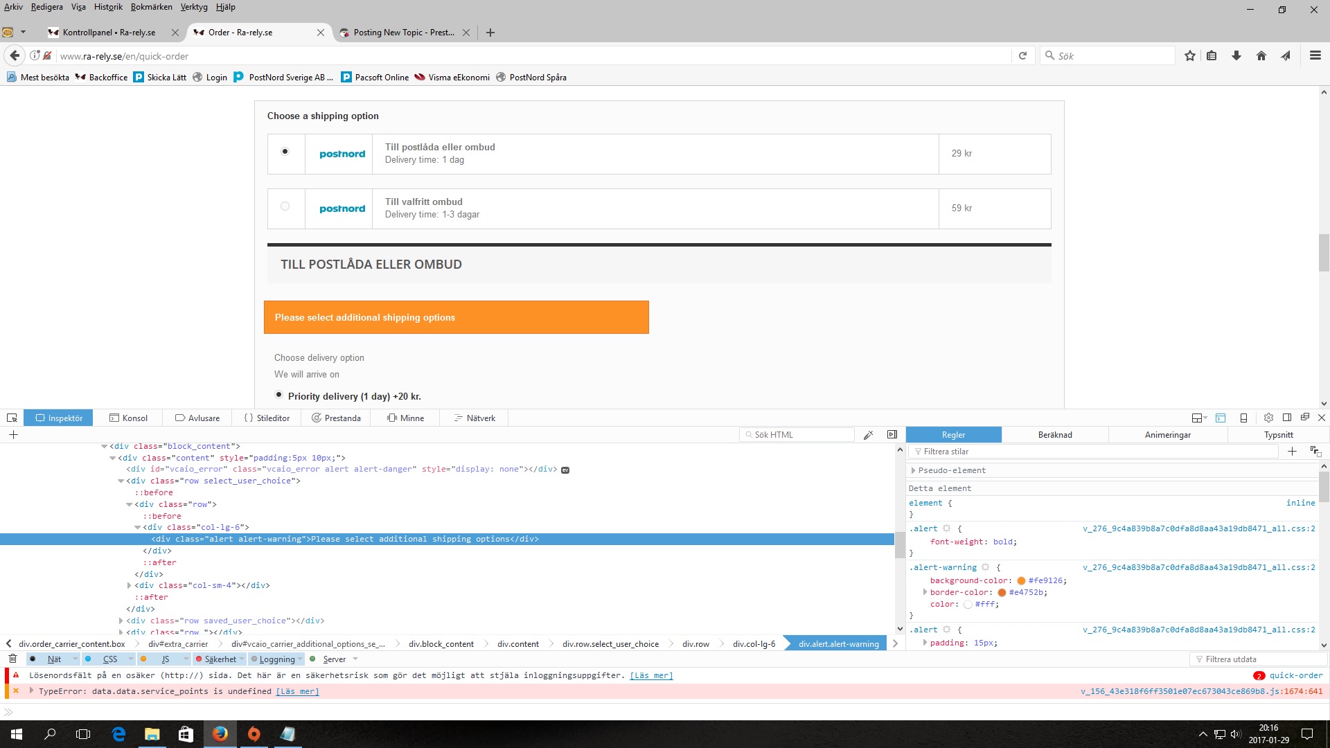 Ricky Blunda Posted January 29, 2017 Share Posted January 29, 2017 (edited) Hello I need help again translating what I believe is a Prestashop generic alert message - it shows in a 3rd party delivery module, but I cant find the string anywhere in their files. Please, go to my site: www.ra-rely.se and put anything in the basket. Choose the default delivery option (first out of two options) - no need to fill out the adress or anything. Then click the blue button with the name "Update Selection" - a frame will open up displaying an orange box with the words "Please select additional shipping options" <-- this is what I want to change, but I dont know where to find it. Please see attached image with a web inspector open. Many thanks! Edited January 29, 2017 by Ricky Blunda (see edit history) Link to comment Share on other sites More sharing options...