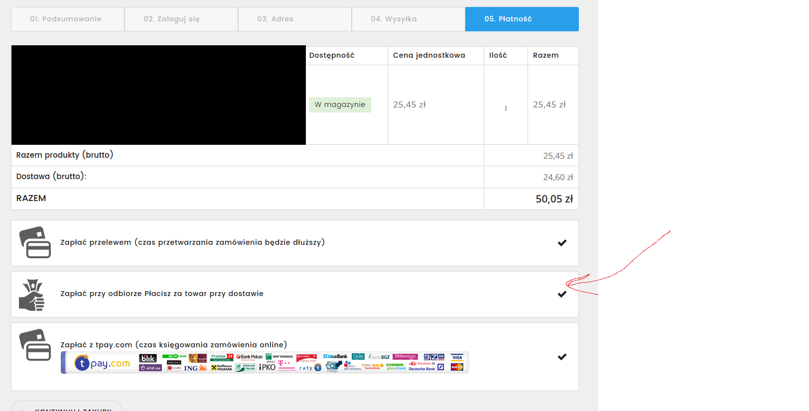 0 sirkawon Posted January 30, 2017 Author Share Posted January 30, 2017 Najpierw wybieramy rodzaj wysyłki (załącznik), a następnie dopiero rodzaj płatności (załącznik). Załóżmy że klient wybiera KURIER PRZEDPŁATA 20ZŁ, następnie przejdzie do PŁATNOŚCI i tam będzie mógł zaznaczyć również POBRANIE. Link to comment Share on other sites More sharing options...