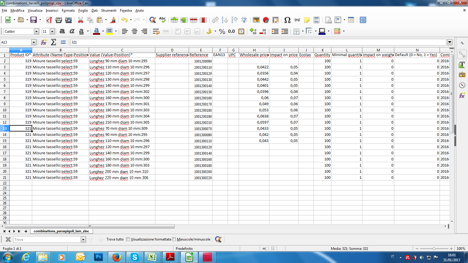 Fabio Visentin Posted January 31, 2017 Share Posted January 31, 2017 Buongiorno a tutti, spero di essere nella sezione giusta; detto ciò ho questo problema, quando vado a caricare i prezzi delle combinazioni già create tramite importazione cvs combinazioni, invece di andare a modificare le vecchie già create mi fa un doppione sotto con gli stessi codici, ciò accade sia nelle combinazioni che negli attributi. Tutto ciò lo faccio con file cvs che carico su prestashop, se vi può essere d'aiuto vi carico anche il file cvs. Spero di essere stato chiaro e che qualcuno mi posso dare una mano, lo ringrazierò. Link to comment Share on other sites More sharing options...