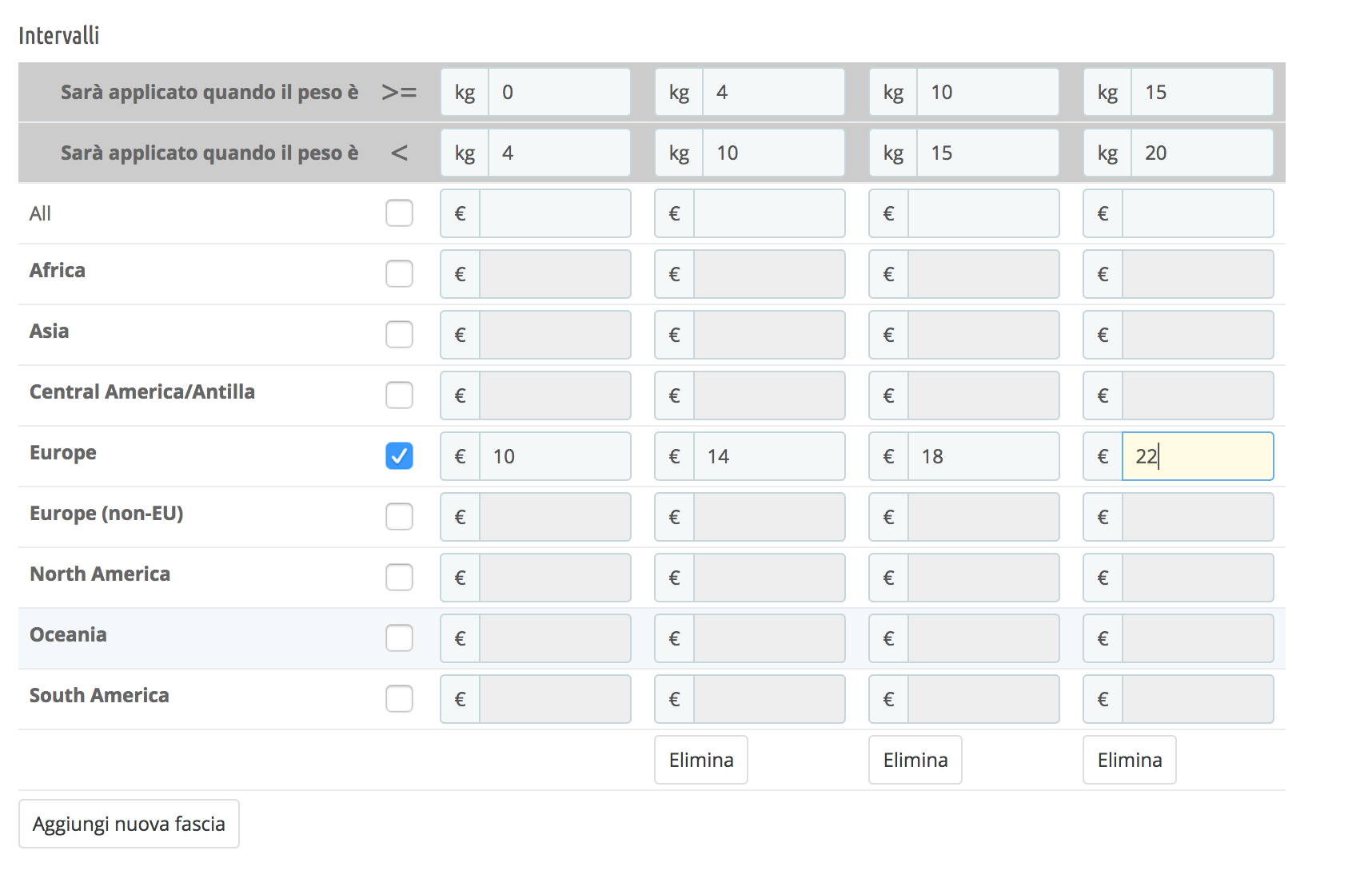Adry1981 Posted February 9, 2017 Author Share Posted February 9, 2017 prova a giocare con le frazioni di peso tipo: Sarà applicato quando il peso è >= 0 4 10 Sarà applicato quando il peso è < 3,999 9,999 15 sicuramente va in conflitto inserendo i pesi uguali per >= e < mi sbaglio ... sembra a posto .... prova a seguire tutti gli step che trovi qui http://doc.prestashop.com/display/PS16/Managing+Carriers magari ricreando il corriere ... sicuro che abilitando il debug come ti dicevano sopra non vedi nessun altro tipo di errore? Non so cosa sia il debug...io l'ho creato e ci sto iniziando a capire qualcosa man mano che ne ho bisogno .... ma non so tutti i termini.... ora elimino il corriere e riprovo Link to comment Share on other sites More sharing options...