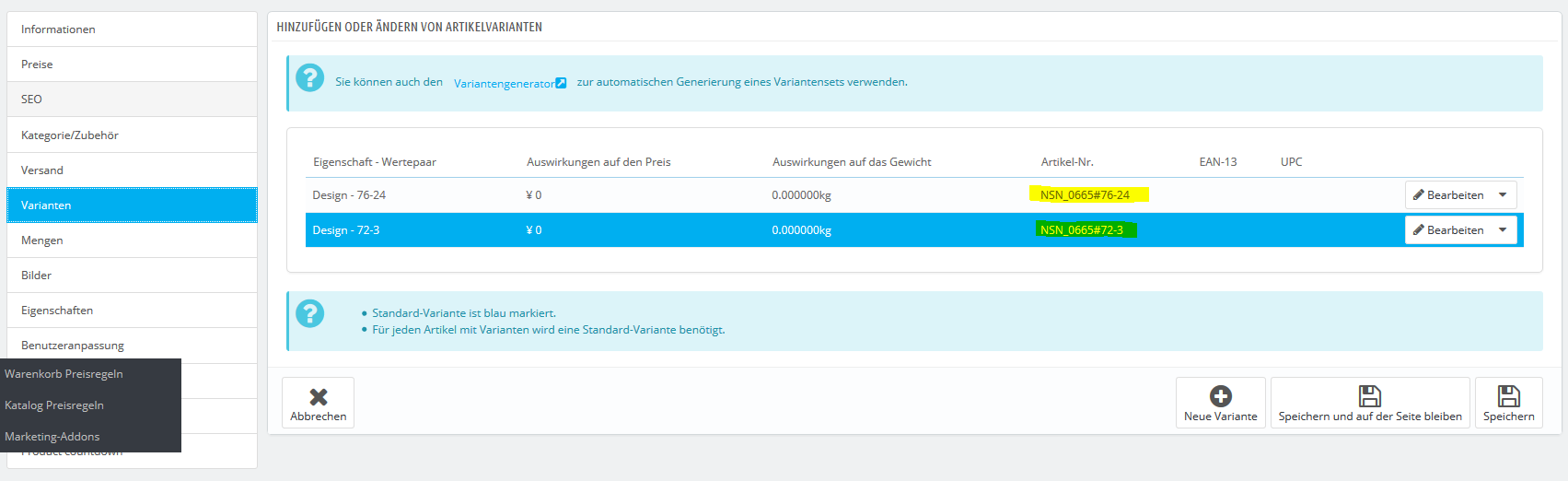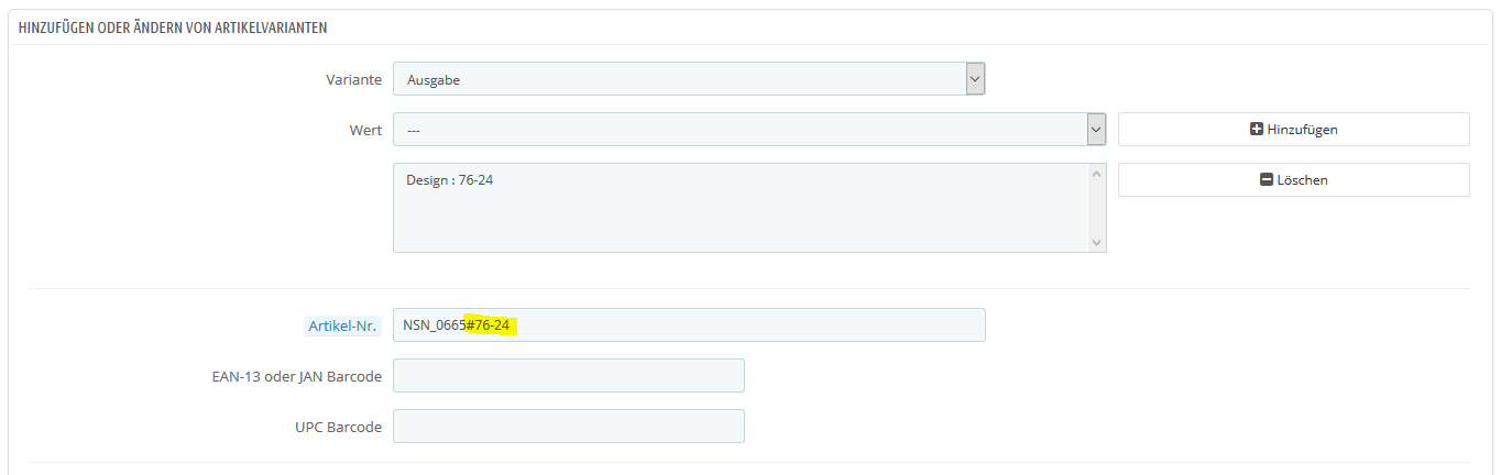 In meinem Beispiel ist die reine Artikelnummer NSN_0665 aber da ich zwei verschiedene Designs habe habe ich die Artikelnummer mit der Designnummer erweitert.