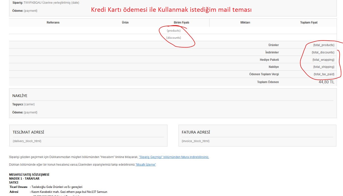 Draft Posted February 5, 2017 Share Posted February 5, 2017 (edited) Merhabalar, Mesafeli satış belgesini müşterinin sipariş onayı maile yerleştirip kullanabildiğimi test ettim.(banka havalesi veya kapıda ödeme seçeneği) Ancak sanal pos denemeleri yapınca müşteriye giden mailde sipariş onayını farklı mail temasını gönderdiğini ve basic bir tema ve herhangi bir ürün bilgisi bulunmuyordu.Eski mail temayı kredikartı ödemesi ile kullanmak istediğimde ürün ve fiyat bilgilerinin gözükmediğini ancak banka havalasiyle bu bilgilerinin de gözüktüğünü farkettim.bu durumu düzeltmek için çok inceleme yaptım ama sonuca ulaşamadım.Sizden ricam;Bu konularla(mail teması) ilgili bilginiz var mıdır? yardımcı olabilir misiniz?Bu konuda acil bilgi ve yardımlarınıza ihtiyacım var.TeşekkürlerNot: Prestashop 1.6.1.17 kullanıyorum. Edited February 5, 2017 by Draft (see edit history) Link to comment Share on other sites More sharing options...