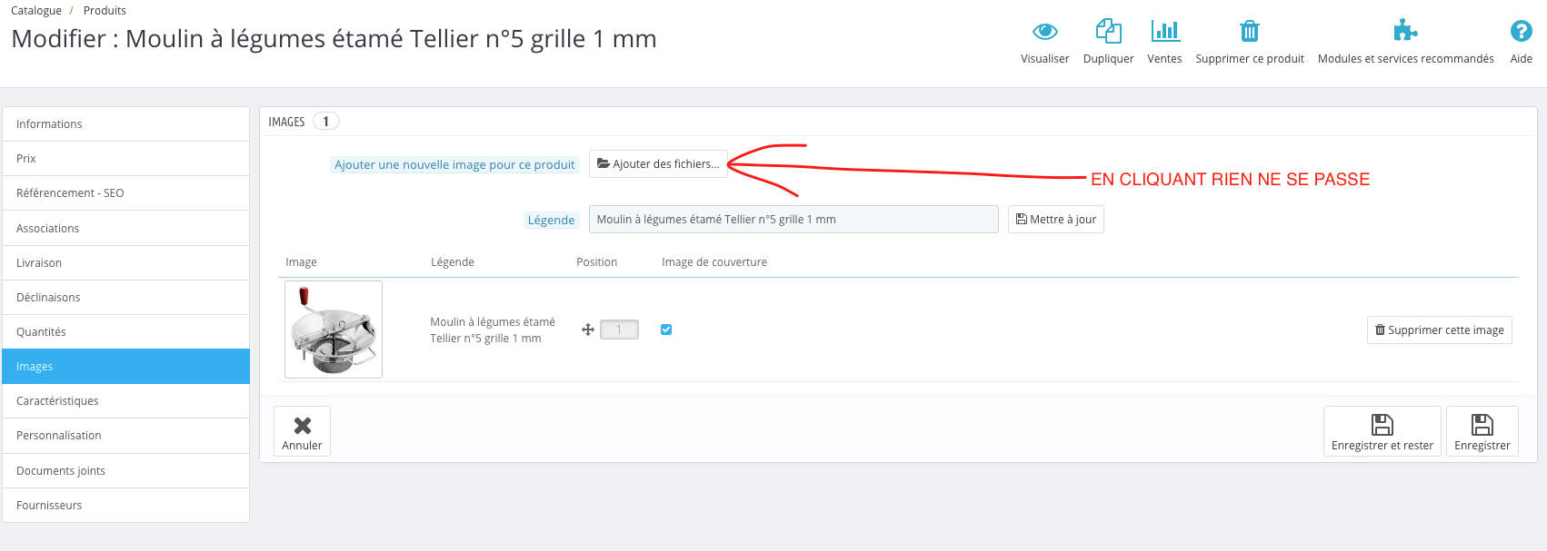 equipecuisine Posted February 6, 2017 Share Posted February 6, 2017 Bonjour à tous, Je rencontre depuis quelques temps un soucis pour modifier les images. Il m'est impossible de modifier ou intégrer une image (produit ou catégorie). Si quelqu'un a une idée je suis preneur. Je suis sous prestashop 1.6.1.9 Au plaisir de vous relire. Link to comment Share on other sites More sharing options...
