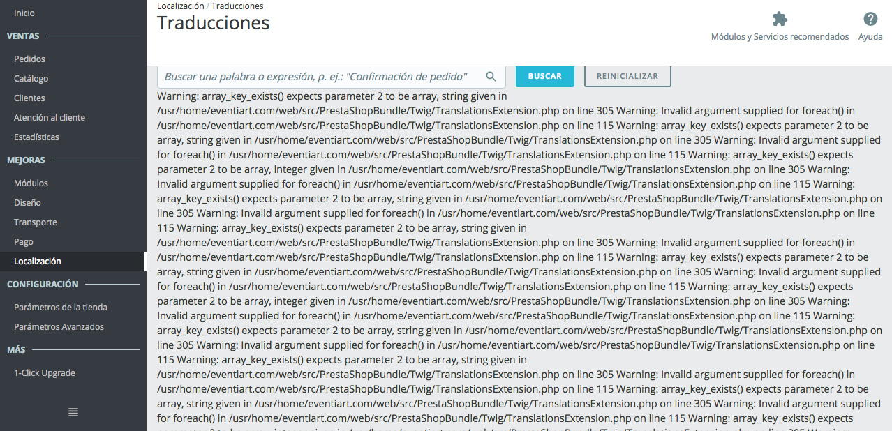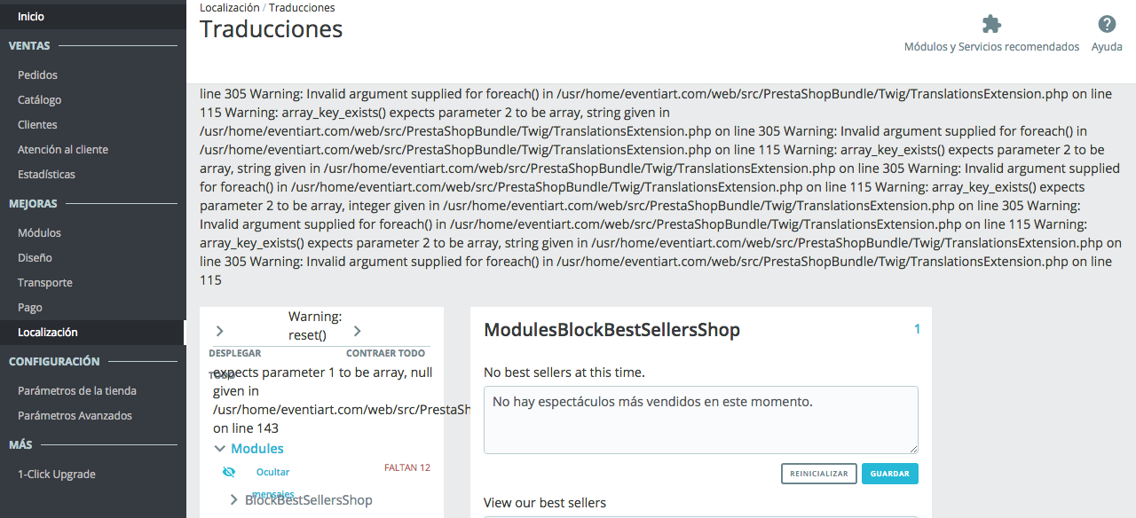 Albou Posted February 6, 2017 Share Posted February 6, 2017 Hola a tod@s, Estoy intentando traducir los títulos de alguno de los módulos instalados en la plantilla que viene por defecto en Prestashop 1.7 , como por ejemplo el de productos de la misma categoría, y al entrar en Localización > Traducciones y seleccionar el modulo a traducir, me aparece esta advertencia de error repetida muchísimas veces y no se a que se debe: (adjunto captura de pantalla también) Warning: array_key_exists() expects parameter 2 to be array, string given in /usr/home/eventiart.com/web/src/PrestaShopBundle/Twig/TranslationsExtension.php on line 305 Warning: Invalid argument supplied for foreach() in /usr/home/eventiart.com/web/src/PrestaShopBundle/Twig/TranslationsExtension.php on line 115 No se si es a raíz de esta advertencia o no, pero los cambios que hago en las traducciones no se ven reflejados en la web. Alguien sabe de que se trata o como solucionarlo? Muchas gracias de antemano Saludos, Link to comment Share on other sites More sharing options...