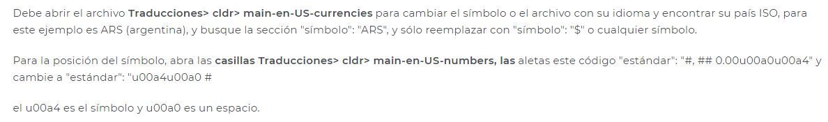 sebasxbox360 Posted April 5, 2018 Share Posted April 5, 2018 40 minutes ago, eridamega said: Entre el espacio y el numero (u00a0 y #,##0) no debes poner la barra invertida, asi los tengo yo accounting":"\u00a4\u00a0#,##0","standard":"\u00a4\u00a0#,##0" El error es por la barra invertida "\standard":"u00a4\u00a0\#,##0" la verde no la tienes y la roja debes eliminarla Gracias capo. Funciona perfectamente. Sin embargo, en el inicio de la página principal de la tienda no se actualizaron de esa forma. El valor "$" todavía aparece al lado derecho. Una vez entras a ver el articulo a detalle ya se cambia al lado izquierdo. A que se debe eso? Link to comment Share on other sites More sharing options...