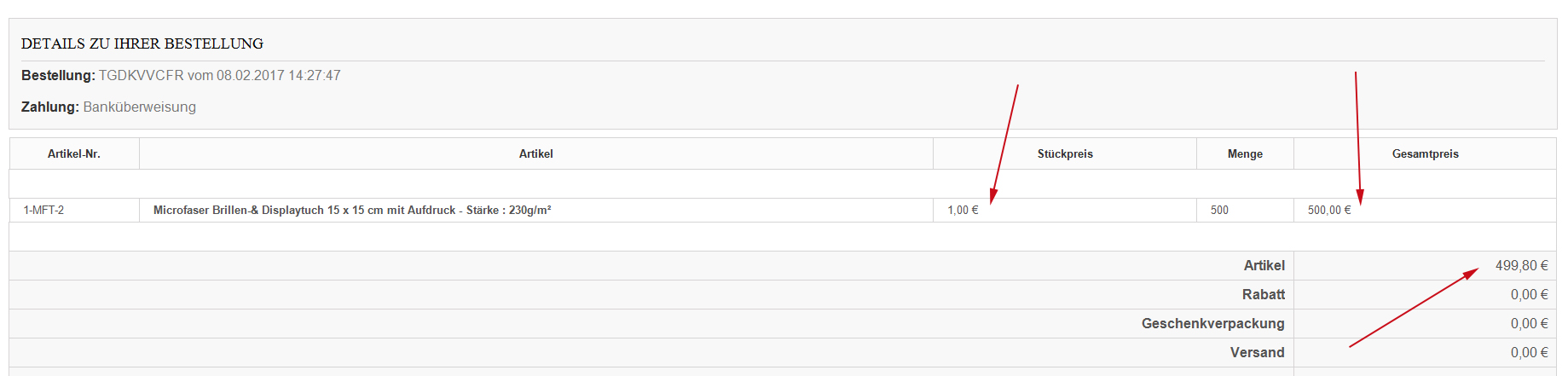 Chriscraft Posted February 8, 2017 Share Posted February 8, 2017 Hallo, unser gesamter B2B Shop (1.6.10 Bootstrap Theme) zeigt die Preise netto und im Warenkorb dann eine Zeile mit der zzgl. MwSt. angabe. Das ist alles korrekt. Leider stehen in der Bestellbestätigung die Preise Brutto beim Stückpreis, beim Gesamtpreis und bei der Zeile Artikel. Es soll aber an den im Screenshot gezeigten Stellen der Nettopreis stehen.Diese Variablen:$product['unit_price']$product['price']für Einzelpreis und Gesamtpreis habe ich in der order_conf_product_list.tpl im Ordner mails/de gefunden, weiß aber nicht wo ich die Variable für den Wert in der Zeile Artikel finde. Selbst wenn, wer kann mir sagen, was ich ändern muss um hier jeweils die Nettopreise auszulesen?Grüße Chris Link to comment Share on other sites More sharing options...