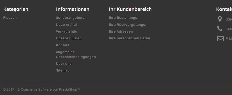 Fonzis Posted February 9, 2017 Share Posted February 9, 2017 Hallo Leute Ich bin neu und am Konfigurieren, runne 1.6 de und versuche vergebens den einzelnen Säuleninhalte des Footers zu editieren aber finde es nicht. Ich habe Kategorien, Informationen und Ihr Kundenbereich Kategorien ist ja klar, hab die originale gelöscht und mal ne eigene gemacht und ist so wie ich es möchte... Wie und wo bearbeite ich Informationen und Kundenbereich Säule? Ich bin sicher ich habs unter der Nase, aber ich sehs einfach nicht :/ Da ich schon dabei bin anstatt einen zweiten Thread zu öffnen frage ich euch auch wegen dem Background von Frames falls die Header und footer als solche zu verstehen sind.... Ich versuch im header und footer den Ihr sieht im Bild, den Background mit nem carbon render zu füllen anstatt einer Füllfarbe. Auch hier tappe ich im Dunkeln Könnt ihr mir helfen? Für eure Geduld bedanke ich mich im Voraus Link to comment Share on other sites More sharing options...