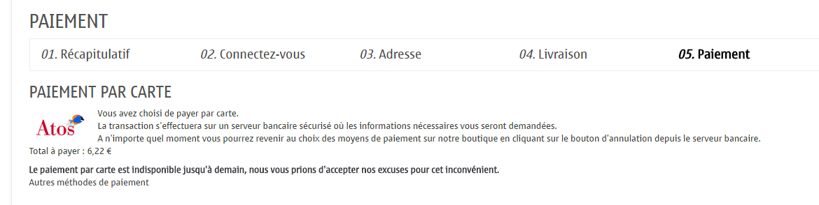 "Le paiement par carte est indisponible jusqu'à demain, nous vous prions d'accepter nos excuses pour cet inconvénient."