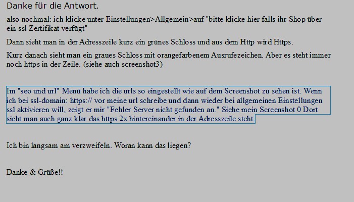rictools Posted February 15, 2017 Share Posted February 15, 2017 also nochmal: ich klicke unter Einstellungen>Allgemein>auf "bitte klicke hier falls ihr Shop über ein ssl Zertifikat verfügt" Dann sieht man in der Adresszeile kurz ein grünes Schloss und aus dem Http wird Https. Kurz danach sieht man ein graues Schloss mit orangefarbenem Ausrufezeichen. Aber es steht immer noch https in der Zeile. (siehe auch screenshot3) Ja, so weit erst einmal OK. Und wieder meine Frage, und weiter? Ich wiederhole mich: Normalerweise sollte anstelle des Textes ein Ja- und ein Nein-Button erscheinen, wobei du dann wohl noch auf Ja und dann auf Speichern klicken müßtest. Erschienen die Buttons, hast du Ja geklickt und gespeichert, ggf. nochmal kontrolliert? Es kann sein, daß du noch die Caches löschen mußt. Die Domains sind richtig eingetragen. Link to comment Share on other sites More sharing options...