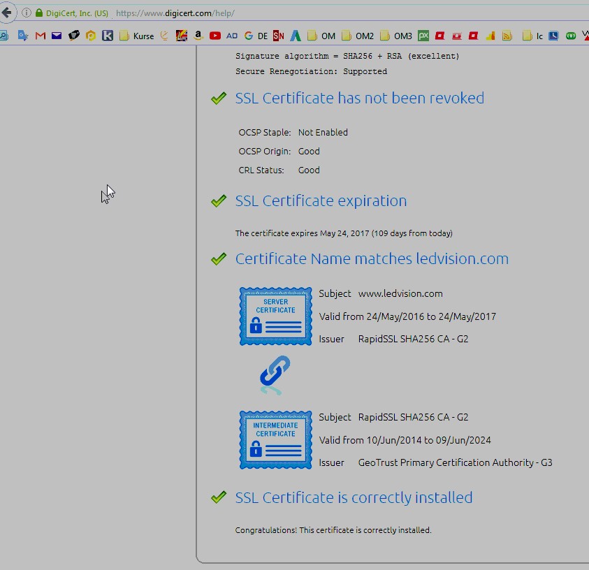 magicmike-0815 Posted February 15, 2017 Author Share Posted February 15, 2017 Was für ein Zertifikat hast du denn? Wir hatten bei unserem Provider die Wahl zwischen zig verschiedenen, haben dann ein Günstiges genommen aber das funbktionierte nicht mit Presta weil nicht jede Seite mit https übermittelt wurde sondern nur Loginseiten und Warenkörbe. Ich habe jetzt nochmal mit dem1&1 ssl checker getestet. https://hosting.1und1.de/ssl-check Und der sagt SSL Zertifikat ist richtig installiert 1 Warnung(en) (Der BEAST-Angriff wird auf diesem Server nicht abgeschwächt.) 0 Fehler Informationen über das Zertifikat:DV Dieser Server nutzt ein domainvalidiertes (DV) Zertifikat. Informationen über den Seitenbetreiber konnten nicht bestätigt werden. Die Daten sind zwar geschützt, doch es wird nicht empfohlen vertrauliche Personen- und Finanzdaten auszutauschen. Common name: www.meinedomain.com SAN: www.meinedomain.com, meinedomain.com (hier habe ich "meine domain" eingesetzt für diesen post stand vorher die richtige drin) Gültig seit: 2016-MAY-24 0:0:0 Gültig bis: 2017-MAY-24 23:59:59 Status des Zertifikats: Valid Revocation check method: OCSP Organisation: Organization unit: Stadt/Ort: Bundesland/Gebiet: Land: Certificate Transparency: Embedded in certificate Seriennummer: 694a16456f3d258f7e58e004672dca90 Algorithmus: SHA256withRSA Verschlüsselungsstärke: 2048 wie kann ich denn herauskriegen ob dieses Zertifikat kompatibel ist, oder ob ich ein anderes brauche? Danke Euch vielmals! Grüße Link to comment Share on other sites More sharing options...