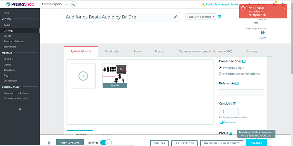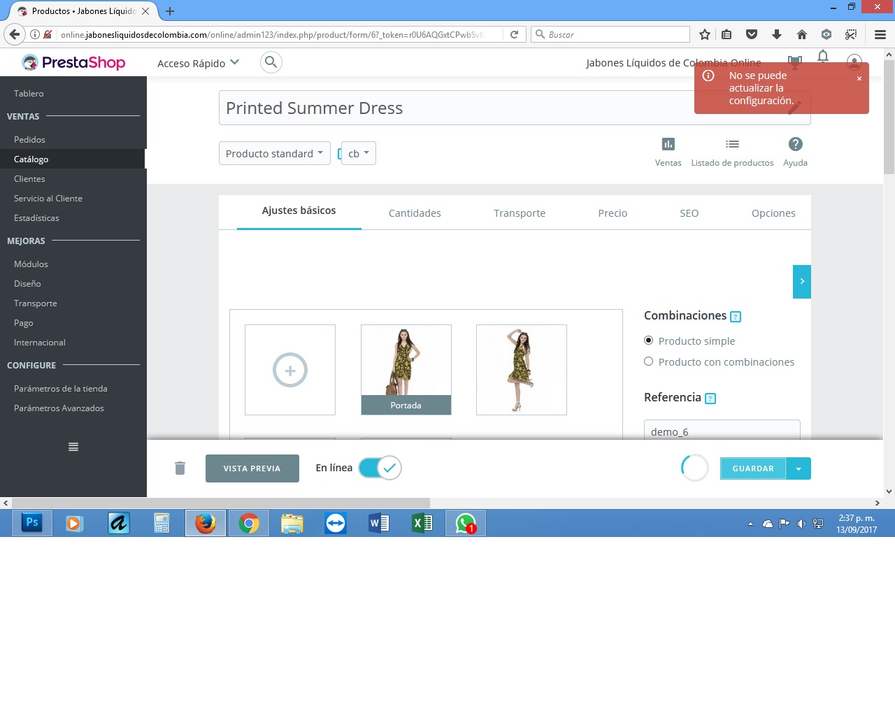 shoraght Posted February 13, 2017 Share Posted February 13, 2017 (edited) Bueno cuando instale la version 1.7.0.2 podía actualizar la información de los productos, pero tenía otros problemas bueno por esto fue que actualice a la 1.7.0.4 (pensando que mejoraría) pero ahora no puedo modificar la información de los productos, es decir, puedo ingresar a la información del producto pero al momento de guardar dichos cambios como por ejemplo el precio, la cantidad o la categoría, me muestra un mensaje de NO SE PUEDE ACTUALIZAR LA CONFIGURACIÓN y me sale la pestaña de ajustes básicos con rojo. si pudieran ayudarme por favor soy nuevo con el tema de prestashop, adjunto una imagen del error, gracias. Edited February 13, 2017 by shoraght (see edit history) 1 Link to comment Share on other sites More sharing options...