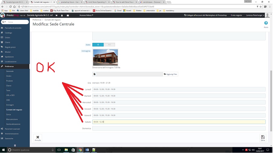 lore_peter Posted February 14, 2017 Share Posted February 14, 2017 Hi, my problem is that when I edit the opening hours of one of my stores (preferences > store contacts > and then modify one of my 5 stores) something goes wrong. I want my shop to stay open from Monday to Saturday in these hours 09.00 - 12.30; 15.30 - 19.30, but for some reason in the Saturday field I can write only these hours 09.00 - 12.30 because if in this day I write also 15.30 - 19.30 prestashop deletes every other hour of every other day (after I clicked save, I go back and all the fields of all the days are empty; ). How can I solve it? Are there some time limitations I am not aware of? see the images if you don't understand just ask again Thanks Lorenzo Link to comment Share on other sites More sharing options...