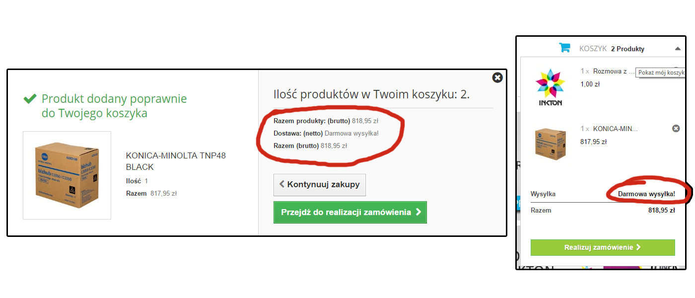 W jaki sposób mogę edytować treści zaznaczone w załączniku w tych dwóch widokach. Lewa strona to widok po dodaniu produktu do koszyka, a prawa strona to widok po najechaniu kursorem na koszyk. Czemu cena raz jest netto a raz brutto i czemu pokazuje darmowa dostawa skoro nikt jeszcze nie wybrał sposobu dostawy.