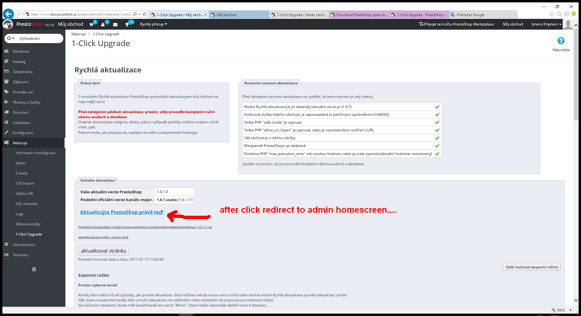 Když kliknu na tlačítko "Aktualizujte prestshop právě teď" tak to přesměruje na základní screen admina, v mém případě blabla/admin99