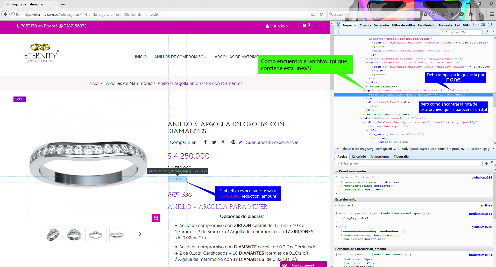 jfbalcazar Posted February 18, 2017 Share Posted February 18, 2017 Hola compañeros, primero quiero agradecer a todos ustedes por dedicarle tiempo a este foro y alimentarlo con sus respuestas. Me gustaría saber como encontrar la ruta a un archivo TPL especifico desde mi buscador presionando F12.... con los archivos .css funciona de maravilla pero hasta ahi llego. Solo a modo de ejemplo en este caso quiero ocultar un valor de descuento en mi producto pero no consigo saber el nombre y ruta del archivo que debo modificar. Dejo una imagen para que sirva de guia. Muchas gracias, pd: si alguen conoce el archivo a modificar para adelantar el trabajo le agradecería mucho. Link to comment Share on other sites More sharing options...