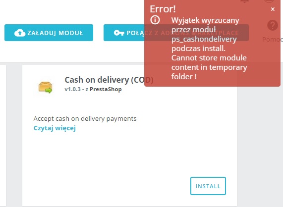 karolp Posted February 19, 2017 Share Posted February 19, 2017 Witam. Mam problem z instalacją modułów z katalogu. Wyskakuje błąd jak w obrazku. Z czego to może wynikać? Dodam, że moduły instalowane przez 'załaduj moduł' działają bez zarzutu. Dodatkowo jeśli ktoś mógłby podesłać moduł cash on delivery pod tę wersję presty, to byłbym wdzięczny. Pozdrawiam Link to comment Share on other sites More sharing options...