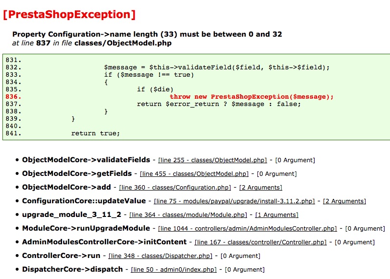 OlivierWebM Posted February 20, 2017 Share Posted February 20, 2017 Hello everybody, My version of Prestashop is 1.5.5.0 I have an error when displaying the Modules Panel under Modules in the menu. It says (see the screenshot for complete message) : [PrestaShopException]Property Configuration->name length (33) must be between 0 and 32at line 837 in file classes/ObjectModel.php Could you please give me some help ? Link to comment Share on other sites More sharing options...