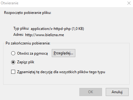 Wgrałem bazę, zmieniłem dostęp do bazy, wyczyscilem cache i przy probie zaladowania strony lub wejscia do panelu admina nie laduje sie nic - tylko rozpoczyna sie pobieranie pliku: application/x-httpd-php
