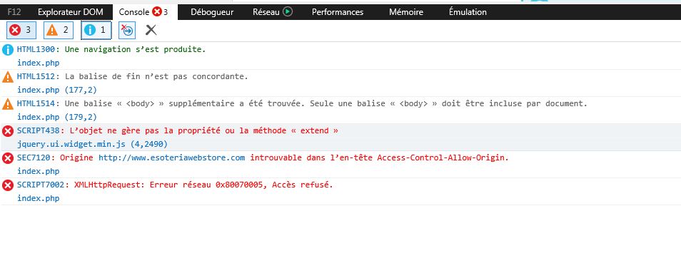 esotéria Posted February 24, 2017 Author Share Posted February 24, 2017 Bonjour Eolia, Oui effectivement, j'ai le même soucis sans le skin :-( Pour ce qui est des modules, je n'ai rien de neuf qui expliquerais pq ca ne fonctionne plus. Après je ne suis pas un pro de l'informatique non plus, il y'à forcément quelque chose qui m'échappe. Voici une capture d'un F12 sans le skin. Par contre pouvez-vous me dire quel est le fichier utilisé pour cette page, je vois qu'il y'à une seconde balise body ...Je pourrais déjà la retirée ? Merci, Link to comment Share on other sites More sharing options...