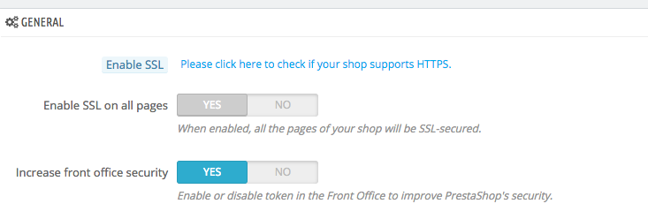 2. The toggle option Yes, No was available earlier on so I selected either Yes or No. After trying to select several times, the toggle option has become something like the screenshot. Enable SSL is now showing the blue link on the right: "Please click here to check if your shop supports HTTPS."