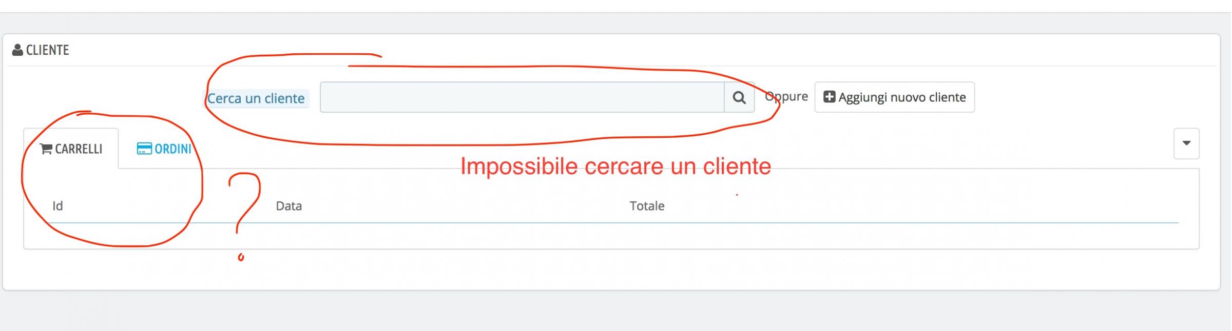 venetaecorecuperi Posted February 25, 2017 Share Posted February 25, 2017 Ciao a tutti, riscontro un problema abbastanza fastidioso, ovvero non è possibile creare un ordine in back office. Quando clicco su "nuovo ordine" si apre la finestra di ricerca del cliente. Tale schermata però e sensibilmente diversa da quella standard (compare infatti anche la scheda carrelli e ordini) e non mi permette in nessun modo di ricercare il cliente per cui creare il nuovo ordine. Mi è successo in diverse installazioni, sia locali che remote. Qualcuno più darmi una mano?? Vedere immagine allegata. Grazie mille!!! Link to comment Share on other sites More sharing options...