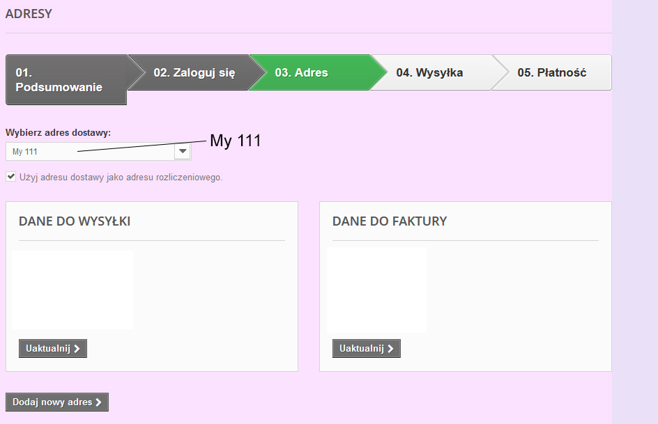 0 endriu107 Posted March 3, 2017 Share Posted March 3, 2017 Ciebie olśniło i rozwiązałeś ale postanowiłeś nie podzielić się z nami rozwiązaniem... Otóż ten tekst ustawia się samemu jako klient podczas dodawania adresu, ustawia się jego alias po to by w gąszczu adresów szybko wyłapać ten na który chcemy otrzymać zamówienie. Link to comment Share on other sites More sharing options...