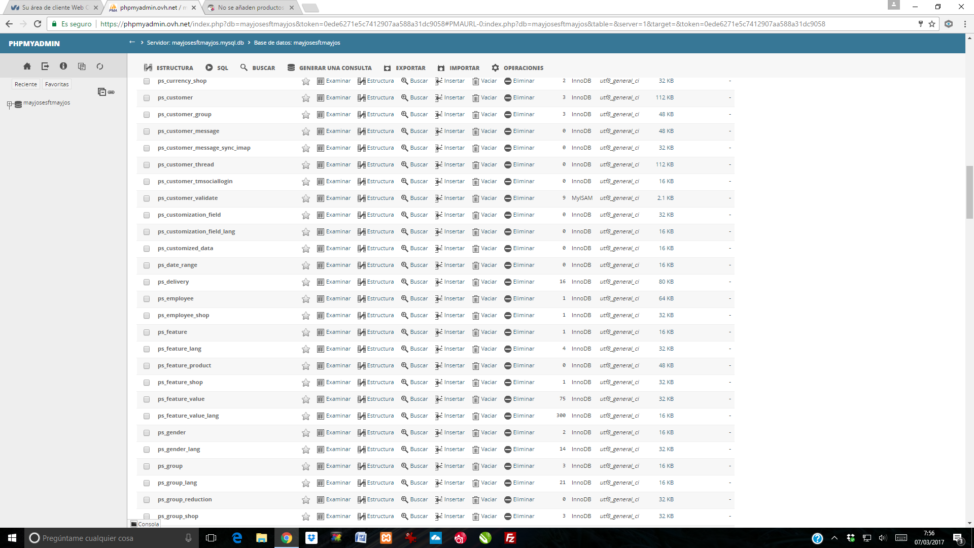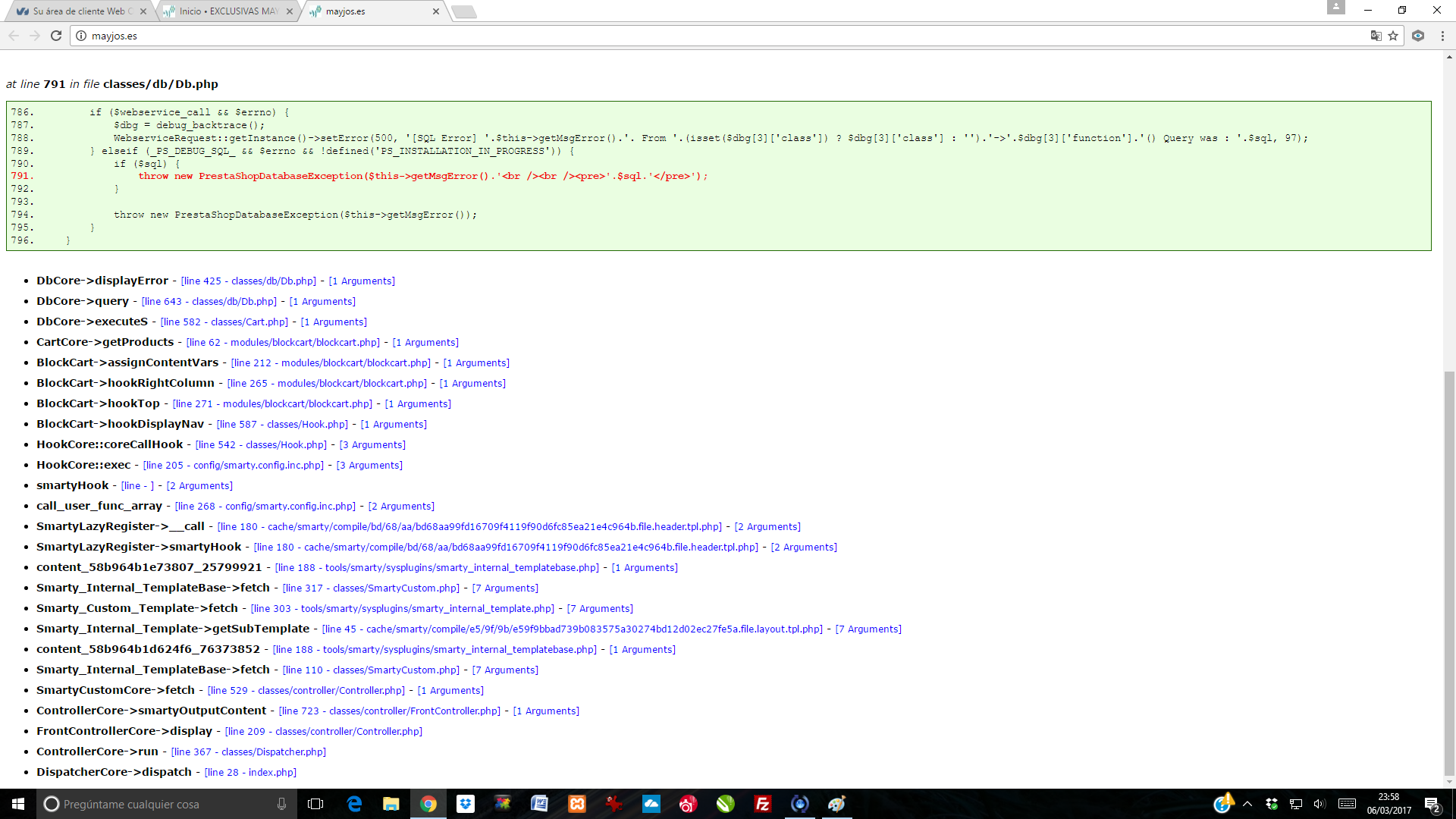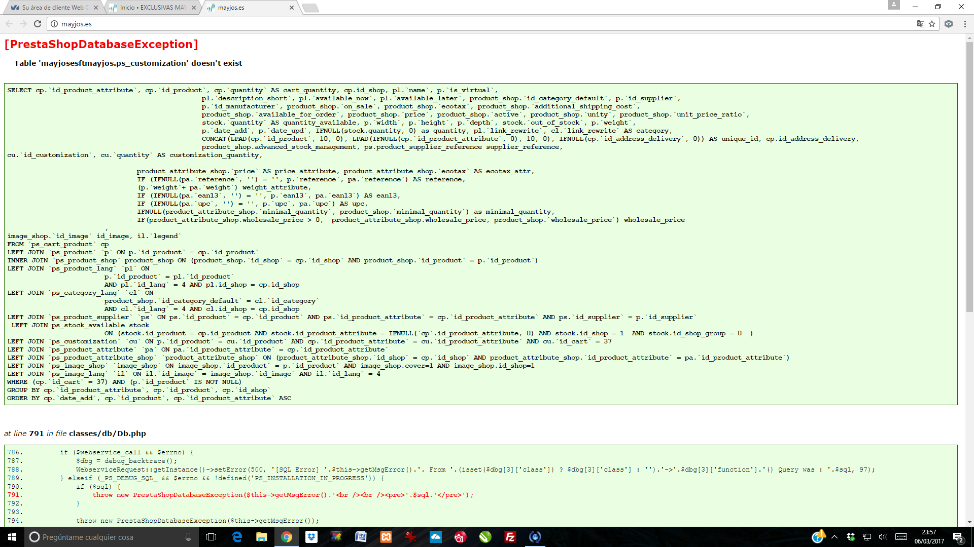 Sergio Ruiz Posted March 6, 2017 Share Posted March 6, 2017 Hola. Gracias por responder. Te paso los errores, que por cierto son varios. debug_1.png debug_2.png El error que mencionas, dice que la tabla: ps_customization no existe. Eso tabla debe existir, junto a otras como ps_customization_field ps_customization_field_lang ps_customized_data Ve a la BD, y dime si existen o no en tu base de datos realmente. Es raro que te falte esa tabla, por simple curiosidad has realizado alguna actualización hace poco de una version antigua a una actual ? 1 Link to comment Share on other sites More sharing options...
