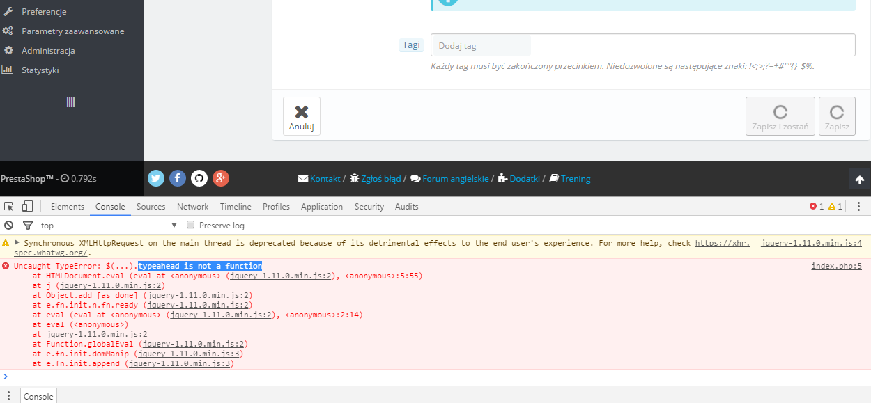 Na stronie produktu nie mogę zapisać zmian. Kółeczka zapisz i zapisz i zostań kręcą się i kręcą w nieskończoność. W konsoli dostaje błąd: typeahead is not a function .