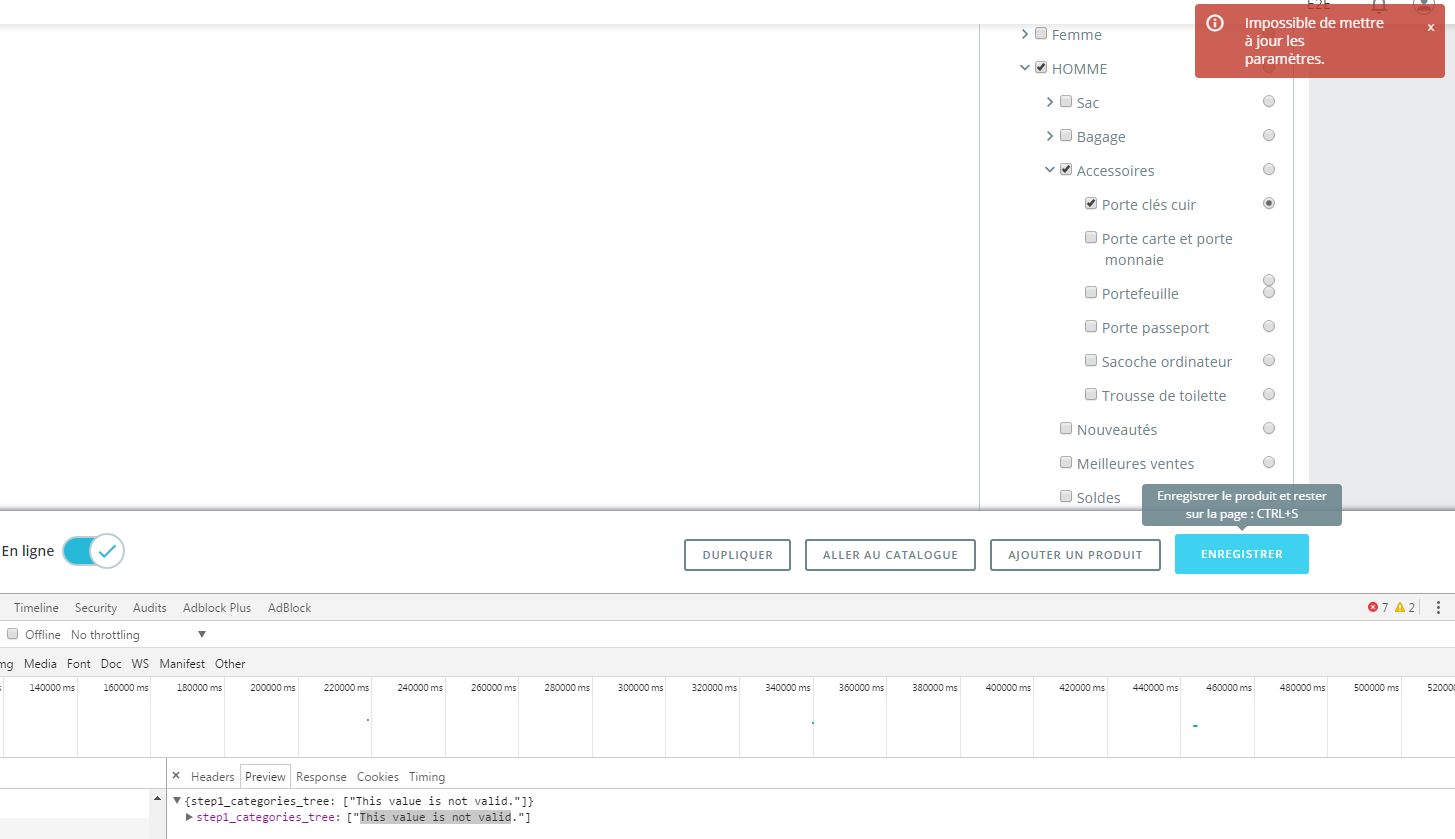 nooneelse Posted March 7, 2017 Share Posted March 7, 2017 Bonjour, J'utilise la version 1.7.0.4 et j'ai un message d'erreur dans l'admin si j'associe mon produit à certaines catégories dans la console du navigateur j'ai ce message dans la réponse de l'appel ajax de la validation {step1_categories_tree: ["This value is not valid."]} Link to comment Share on other sites More sharing options...