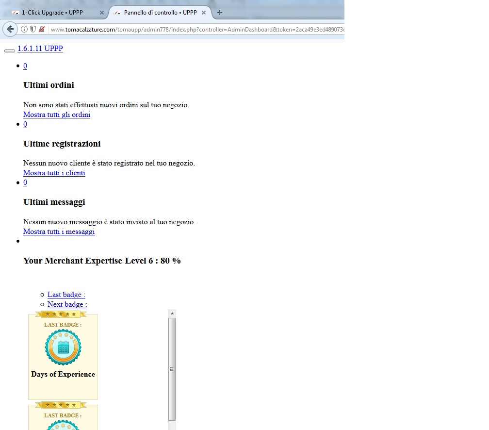 ariom Posted March 9, 2017 Share Posted March 9, 2017 (edited) Buongiorno ragazzi, premetto che non sono molto pratico, ho effettuato un aggiornamento test dalla 1.6.0.9 alla 1.6.1.11 su di un sito clone tramite apposito modulo. Fin qui nulla di strano, ma quando ricarico il back-office ho la seguente schermata. Sapete aiutarmi? Grazie TOMAcalzature se non cambia niente seguendo il consiglio di Sito Lab, forse dovresti controllare i percorsi in ps_shop e ps_shop_url e verificare il file .htaccess il problema potrebbe essere dovuto alla sottocartella tomaupp, dove immagino hai effettuato l'upgrade. Inoltre se vai a http://www.tomacalzature.com/tomaupp/ noterai che l'indirizzo redirige in modo non corretto, quindi presuppongo un problema di percorsi Edited March 9, 2017 by ariom (see edit history) Link to comment Share on other sites More sharing options...
