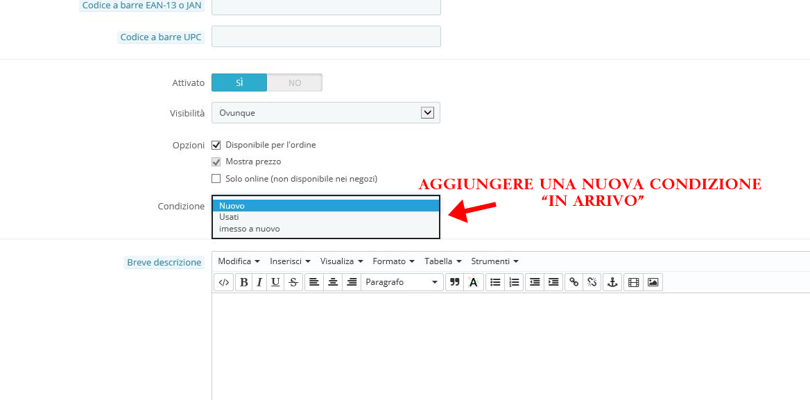 fantasy86 Posted March 9, 2017 Share Posted March 9, 2017 (edited) Ciao a tutti, vorrei sapere se fosse possibile aggiungere una nuova condizione (etichetta) al prodotto: "In arrivo". Semplicemente poter selezionare la condizione "in arrivo" qualora dovessi inserire un prodotto non disponibile, ma che so già che farò riassortimento. Sapreste dirmi come modificare il file che gestisce queste etichette? Non mi interessa una funzione complessa che gestisca le quantità poichè uso la gestione delle quantità manualmente. Grazie mille Vi allego uno screenshot Edited March 9, 2017 by fantasy86 (see edit history) Link to comment Share on other sites More sharing options...