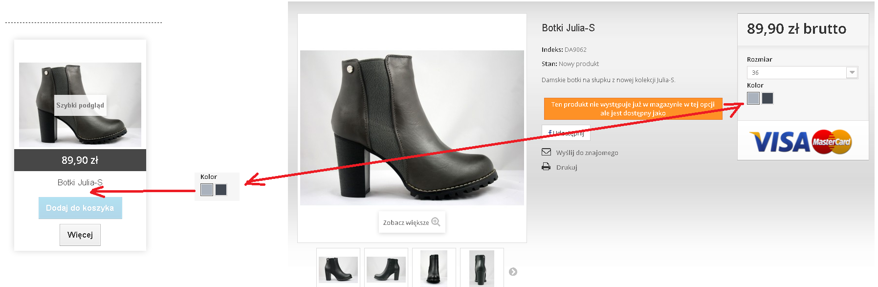 0 design4VIP Posted March 14, 2017 Share Posted March 14, 2017 (edited) niedo konca wiem, co PiotrK mial na mysli, bo to nie blad tylko atrybuty produktu, jak je dodasz (jako atrybuty koloru) to automatycznie pojawia sie i na liscie produkto i w karcie produktu. do kazdego takiego atrybutu mozesz dodac osone zdjecia, wiec w karcie produktu po kliknieciu w dany kolor automatycznie powinno zmianic sie zdjecie. zobacz w ustawienia czystej instalacji sklepu. tam wybrane produkty maja takie rozwiazania. Edited March 14, 2017 by design4VIP (see edit history) Link to comment Share on other sites More sharing options...