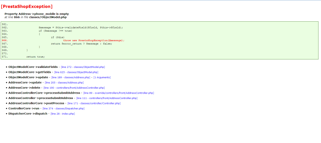 mam problem z aktualizacją adresu klienta. Klient wchodząc na swoje konto, ma mozliwość przeglądu swoich adresów do wysyłki. Moze też uaktualnić te adresy. Wchodząc w opcję uaktualnij na samym dole jest przycisk zapisz. Po kliknięciu tego pojawia mi się "prestashop 500 server error oops something went wrong".