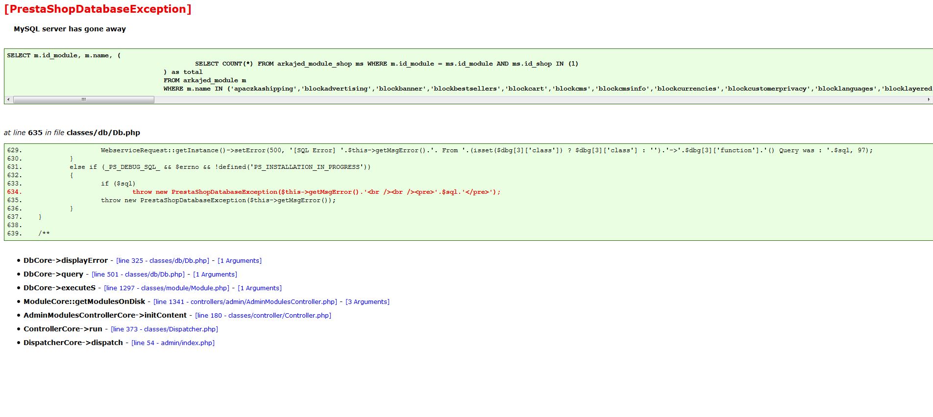 0 e_com Posted March 20, 2017 Share Posted March 20, 2017 Witam, Problem polega na tym ze po zalogowaniu sie do panelu administracji sklepem nie moge przejsc do zakłądki moduły. W zalaczniku przeyslam scrren z komunikatem jaki wyskakuje po probie przejscia do zakladki moduly - w czym moze byc problem? Bardzo słabiutki hosting jak nie może wczytać listy modułów. "mysql server has gone away" to przekroczenie limitu czasu serwera. Link to comment Share on other sites More sharing options...